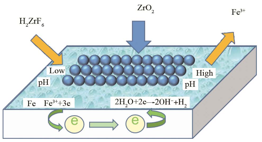 經(jīng)上述反應后,金屬基材表面會形成一種“ZrO2-Fe-ZrO2”結構的溶膠。隨著反應的進行,溶膠的交聯(lián)密度逐漸增大,不斷凝聚沉積,最終形成連續(xù)致密的ZrO2膜層。鋼鐵表面鋯鹽轉化成膜過程原理如下圖: